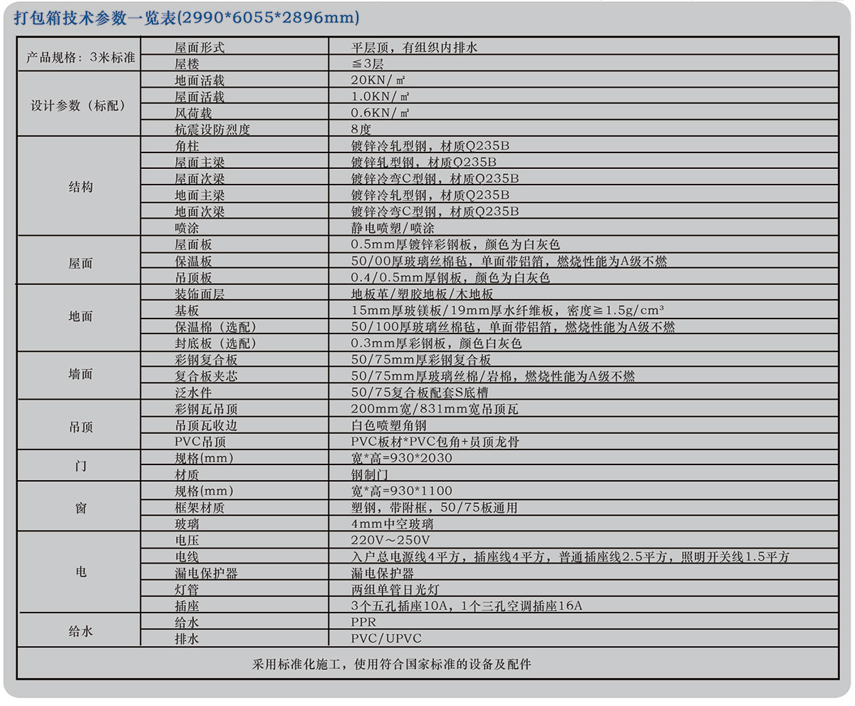 打包箱房结构简单、安全,对基础要求低,具有现场安装快捷、移动搬迁便利、周转次数多、使用寿命长等特点,该产品拆装无损耗,无建筑垃圾,可作为办公、住宿、餐厅、卫浴、娱乐以及组合大空间使用,可满足建筑工程营地、市政临时用房、野外作业营房、紧急安置房、学校、医院、旅游驿站、各类商业用房的需求。